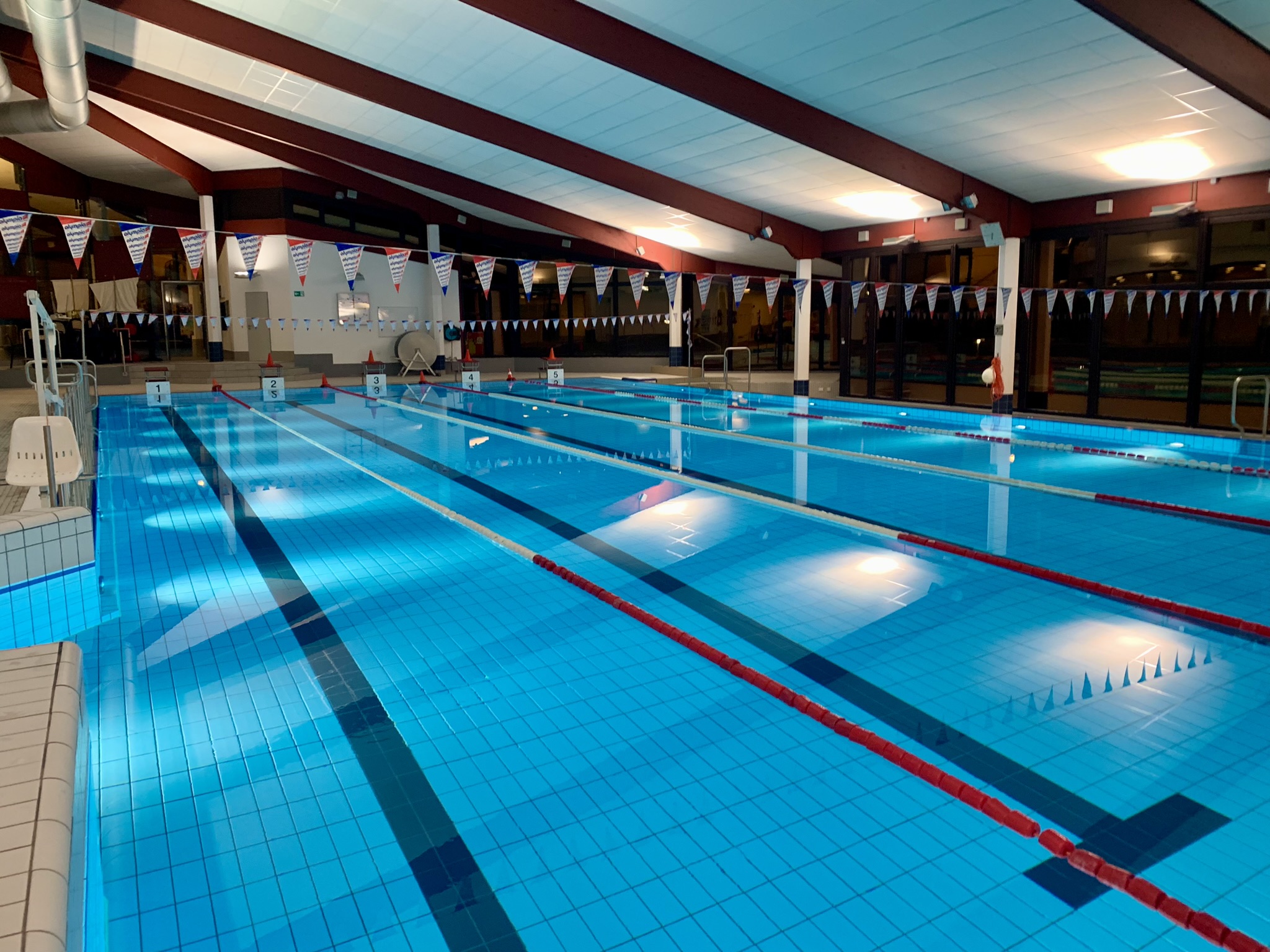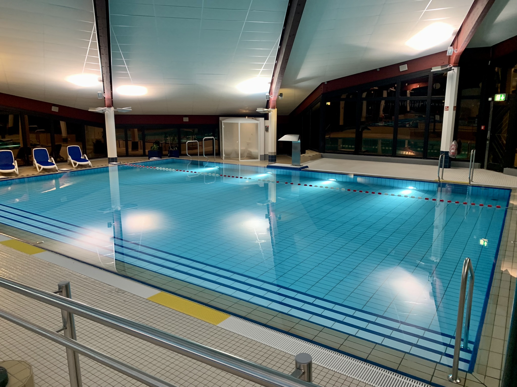 Das Hallenbad verfügt über ein Schwimmbecken mit einer Tiefe von 1,8 m und fünf Bahnen, das für das Schwimm- und Rettungsschwimmtraining genutzt wird.